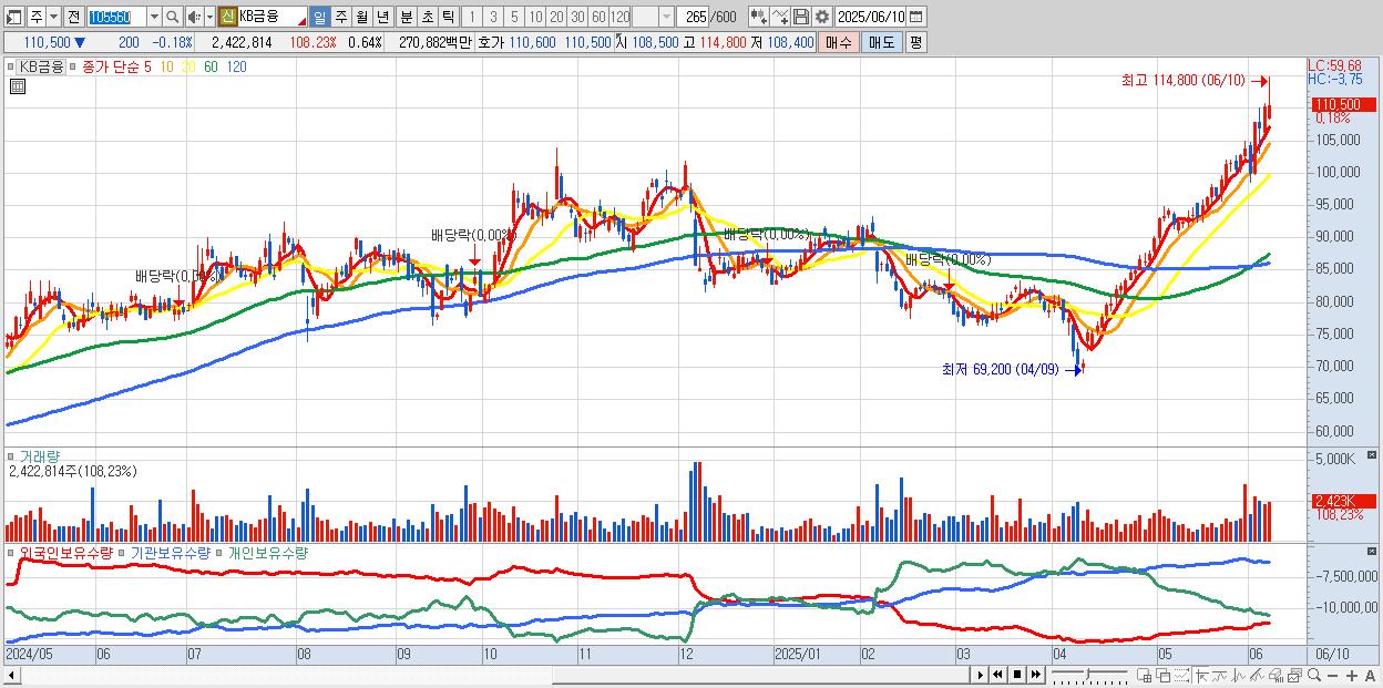 - KB금융 (110,900원 ▲ 0.18% , 시총: 423,041억, 거래량: 2,263,281, 거래대금:2,530억, KOSPI)