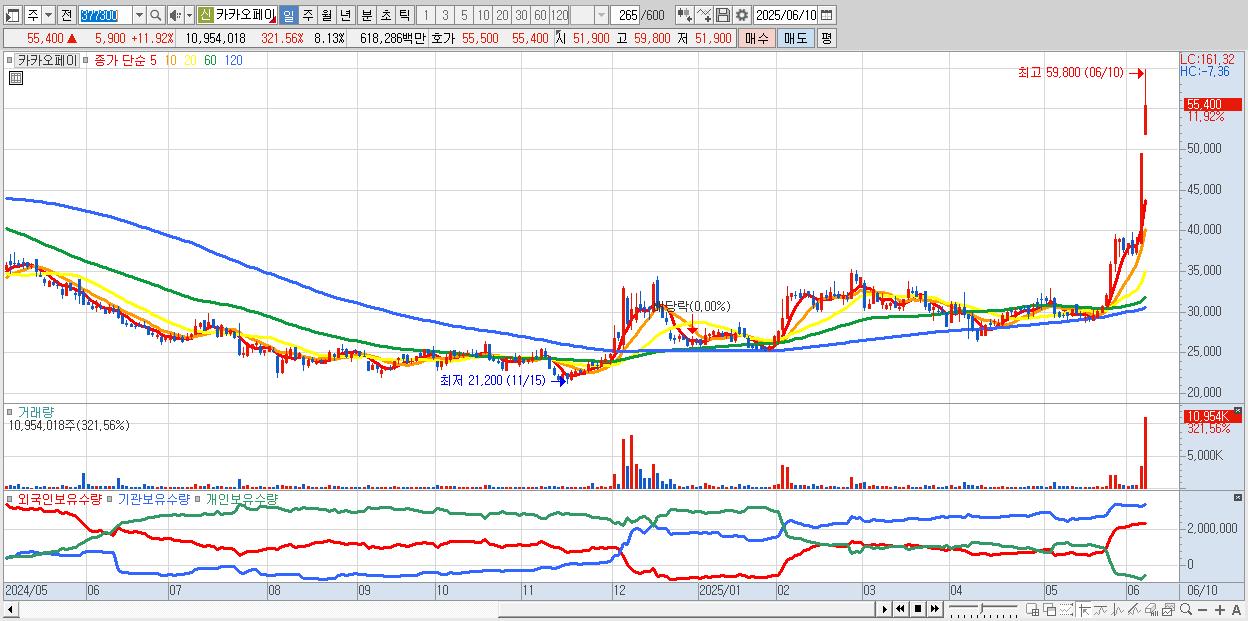 - 카카오페이 (57,400원 ▲ 15.96% , 시총: 77,314억, 거래량: 5,144,110, 거래대금:2,879억, KOSPI)