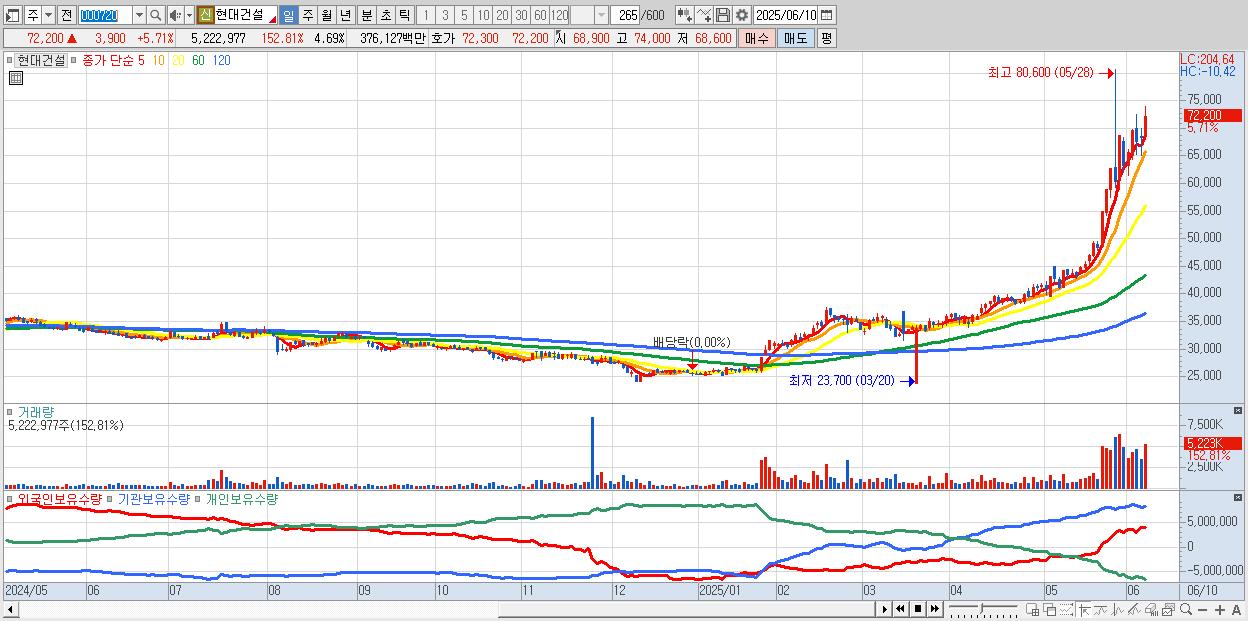 - 현대건설 (72,000원 ▲ 5.42% , 시총: 80,176억, 거래량: 3,161,871, 거래대금:2,280억, KOSPI)