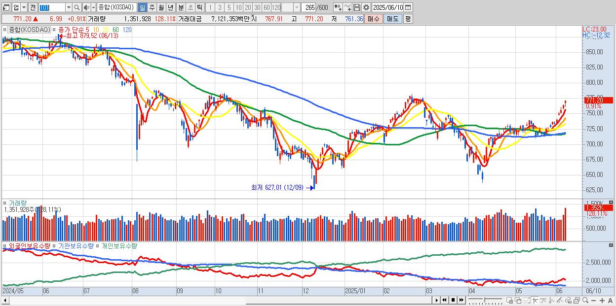 - 코스닥는 개인과 외국인의 순매수하였으며 6.99 포인트(0.91%) 상승 하여 771.20로 마감
