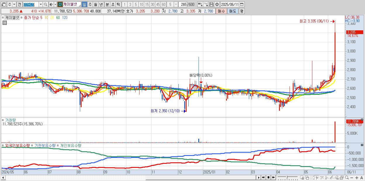 - 케이엘넷 (3,205원 ▲ 14.67% , 시총: 774억, 거래량: 11,788,523, 거래대금:371억, KOSDAQ)