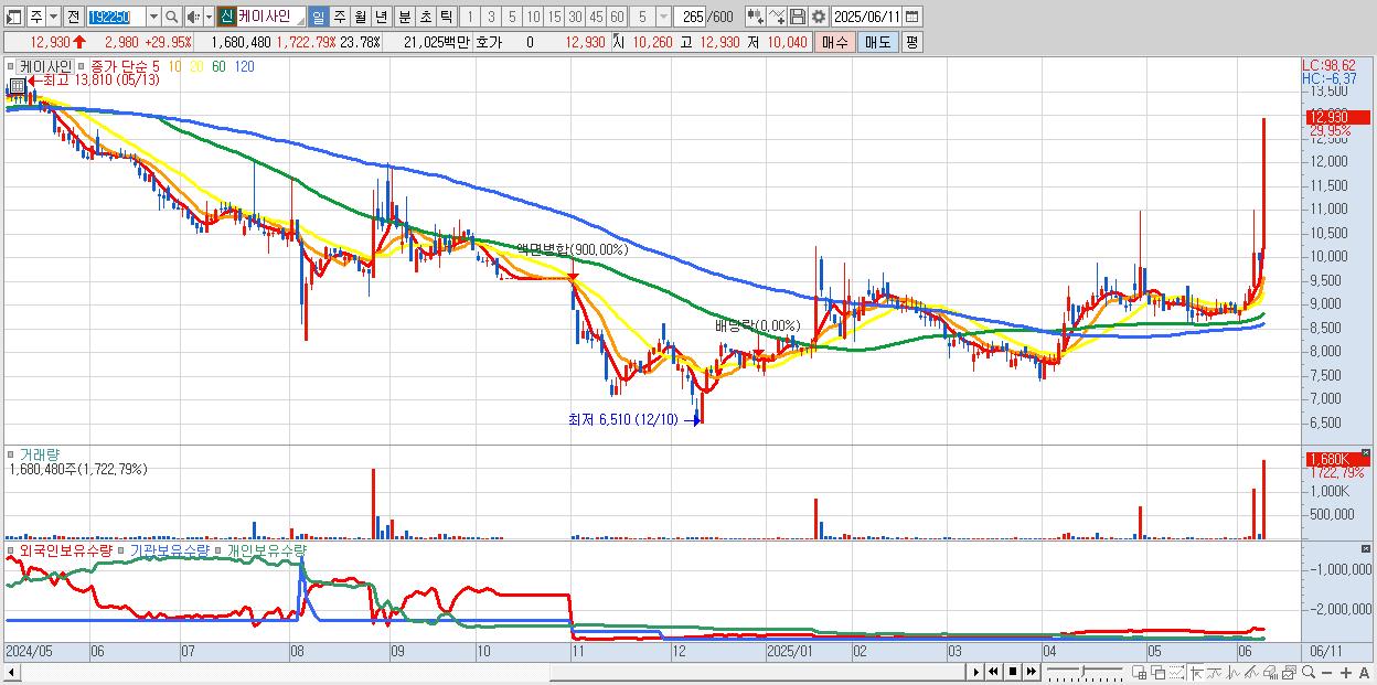 - 케이사인 (12,930원 ▲ 29.95% , 시총: 914억, 거래량: 1,680,480, 거래대금:210억, KOSDAQ)