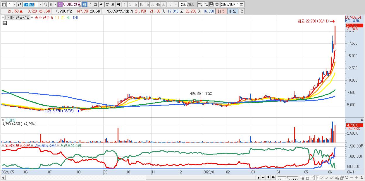 - 아이티센글로벌 (21,150원 ▲ 21.34% , 시총: 4,908억, 거래량: 4,790,472, 거래대금:957억, KOSDAQ)