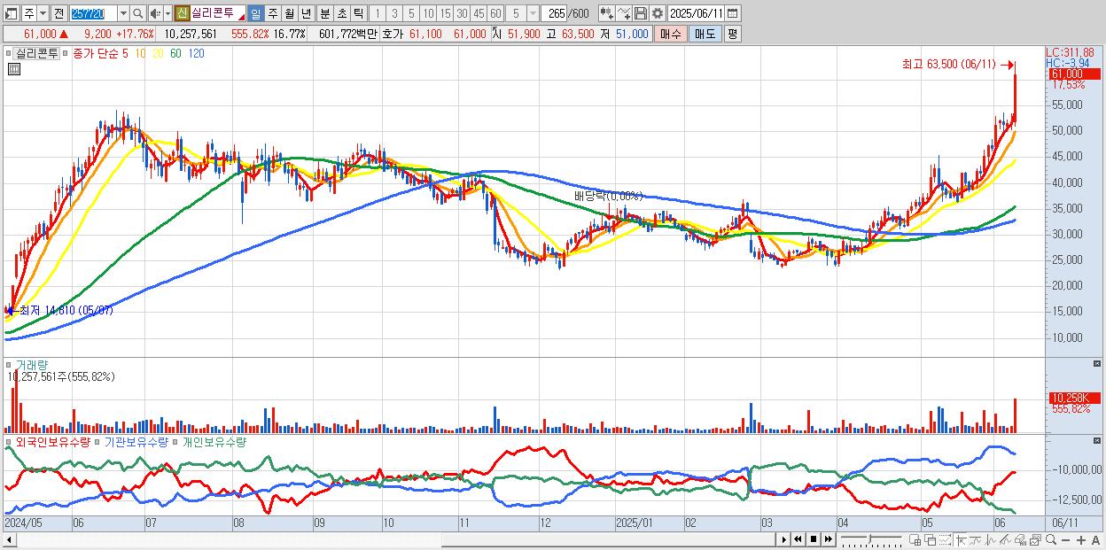 - 실리콘투 (61,800원 ▲ 19.31% , 시총: 37,804억, 거래량: 5,919,674, 거래대금:3,467억, KOSDAQ)