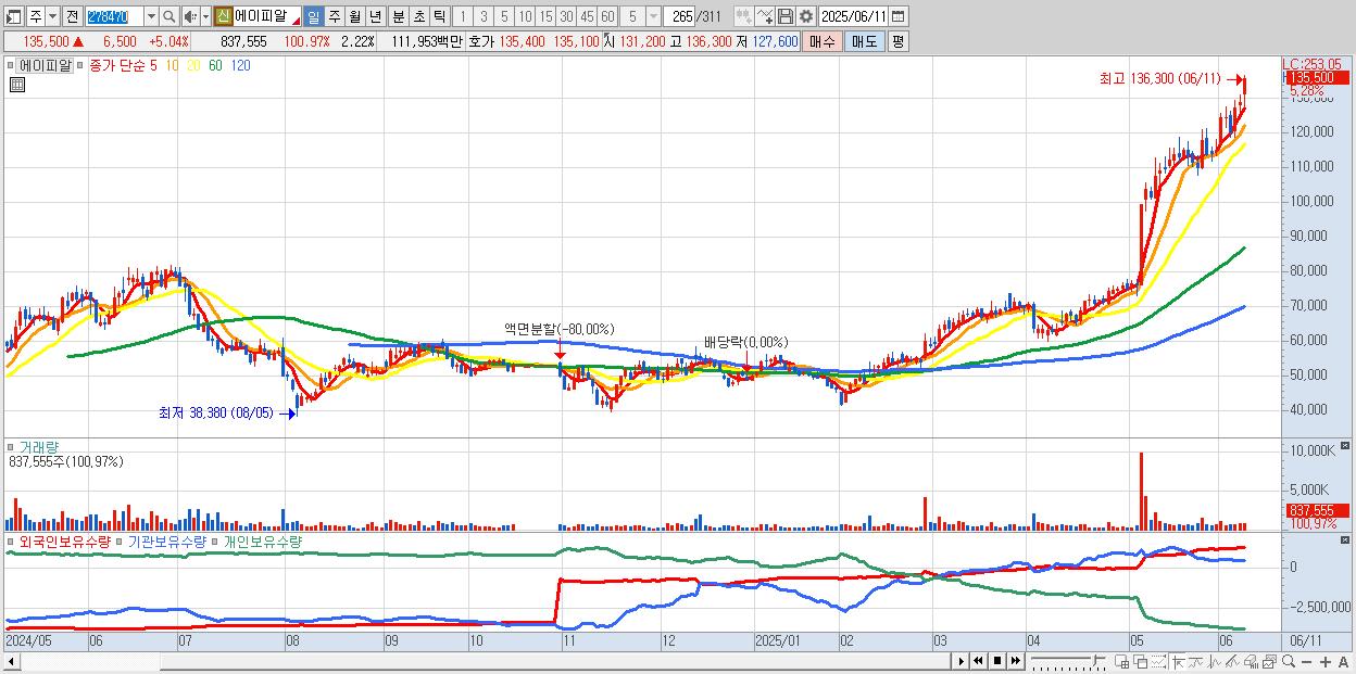 - 에이피알 (136,000원 ▲ 5.43% , 시총: 51,199억, 거래량: 611,006, 거래대금:817억, KOSPI)