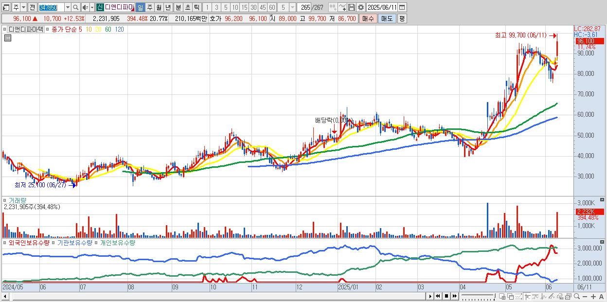 - 디앤디파마텍 (97,400원 ▲ 14.05% , 시총: 10,468억, 거래량: 1,210,811, 거래대금:1,144억, KOSDAQ)