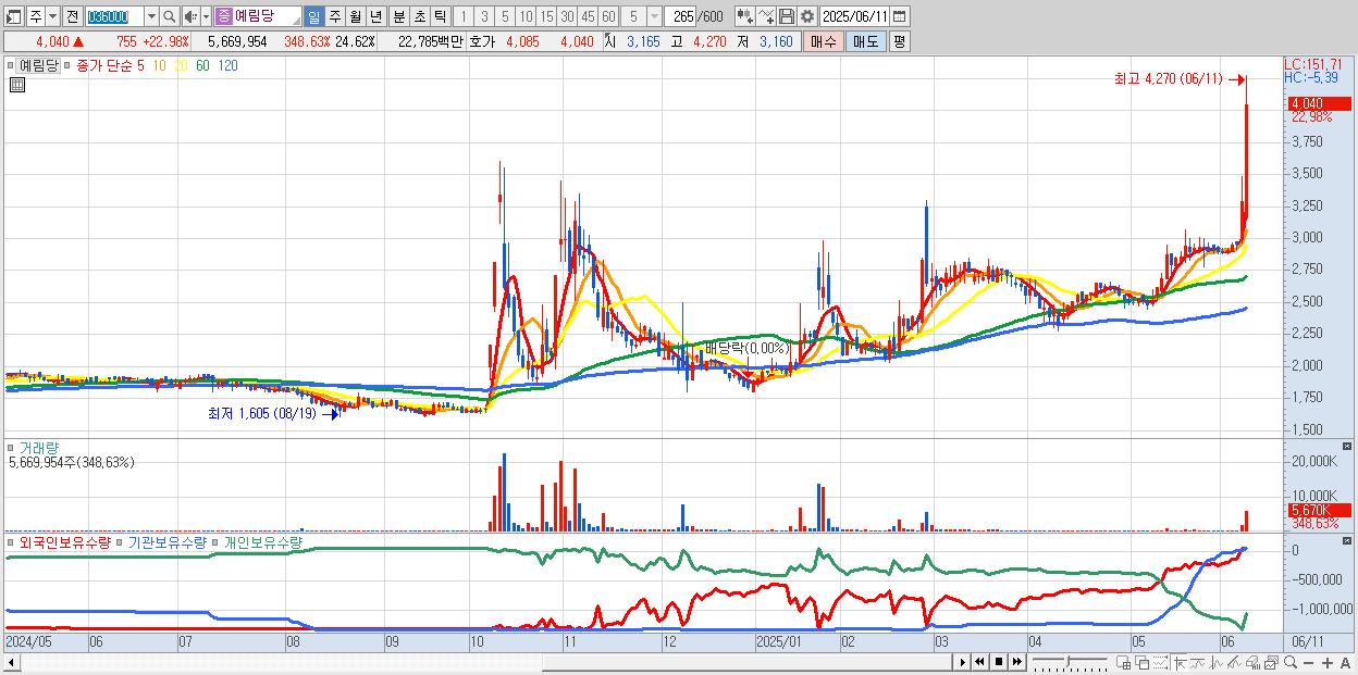 - 예림당 (4,040원 ▲ 22.98% , 시총: 931억, 거래량: 5,669,954, 거래대금:228억, KOSDAQ)