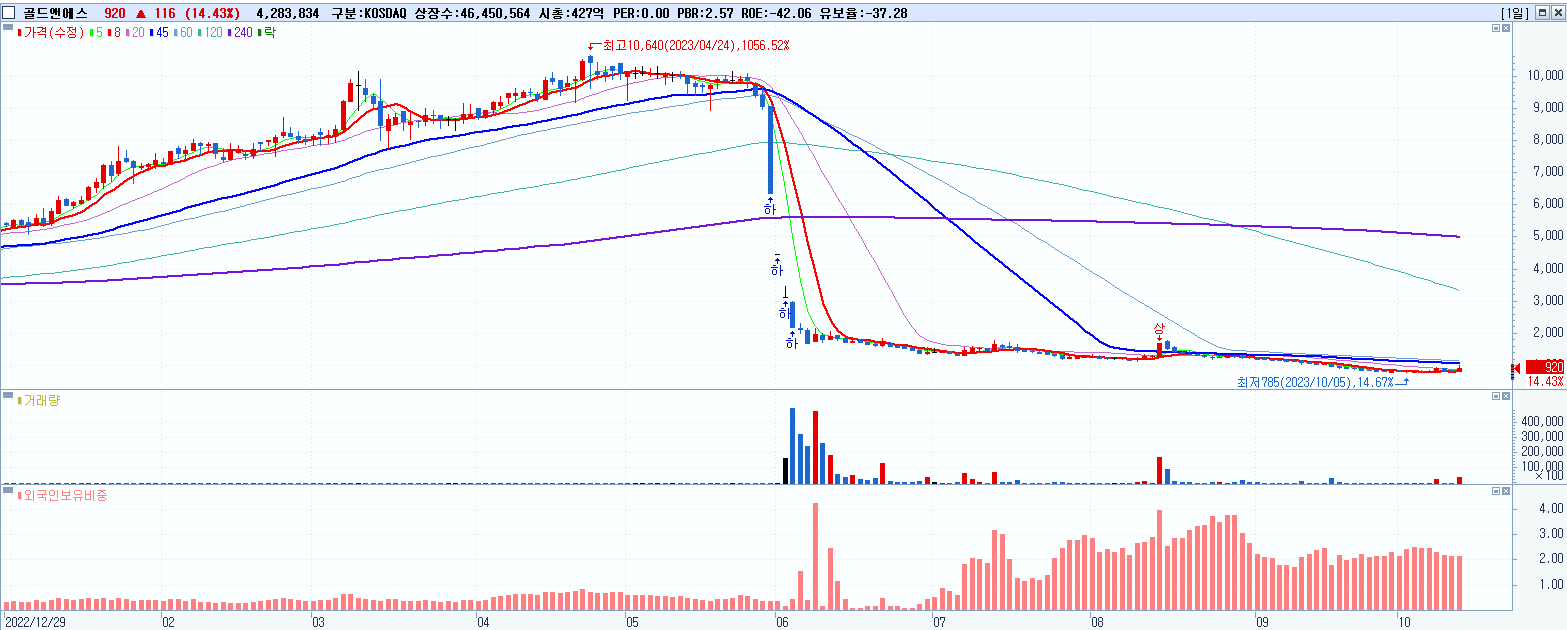 - 골드앤에스 (920원 ▲ 14.43% , 시총: 427억, 거래량: 4,284,715, 거래대금:40억)