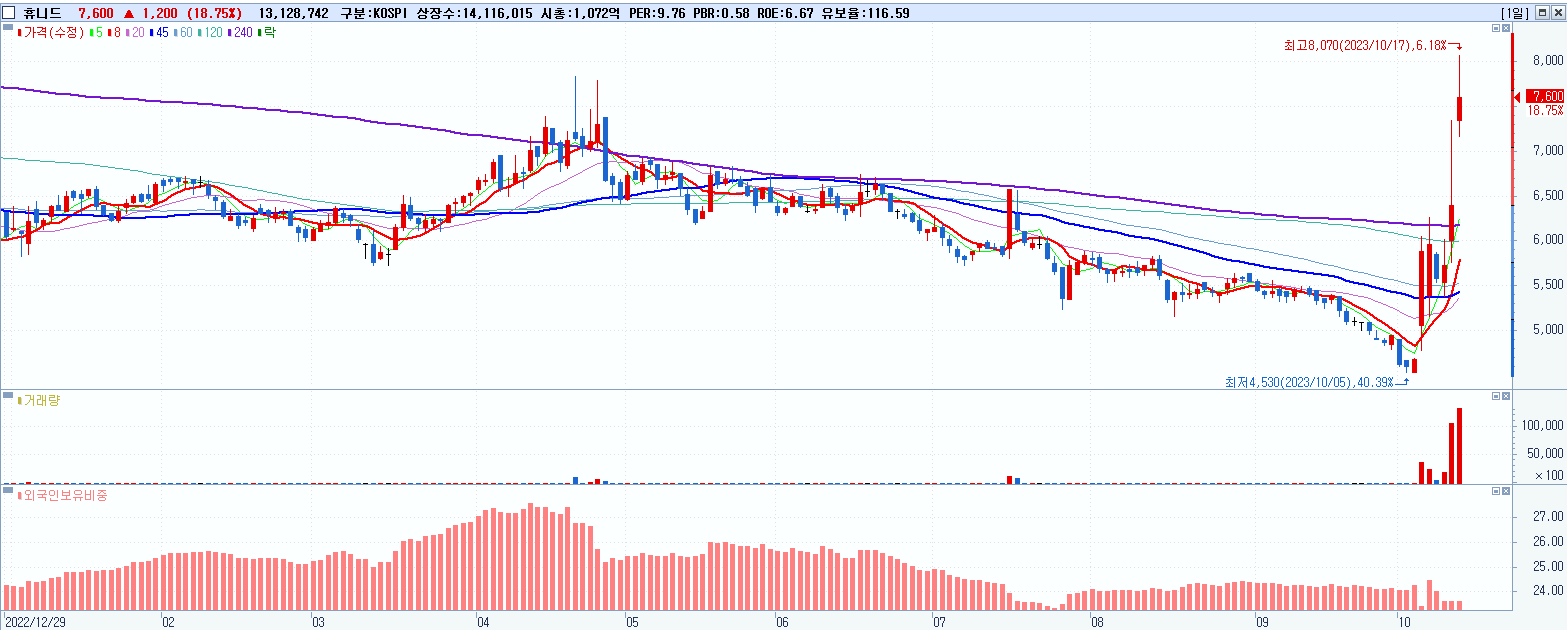 - 휴니드 (7,600원 ▲ 18.75% , 시총: 1,073억, 거래량: 13,168,714, 거래대금:1,002억)