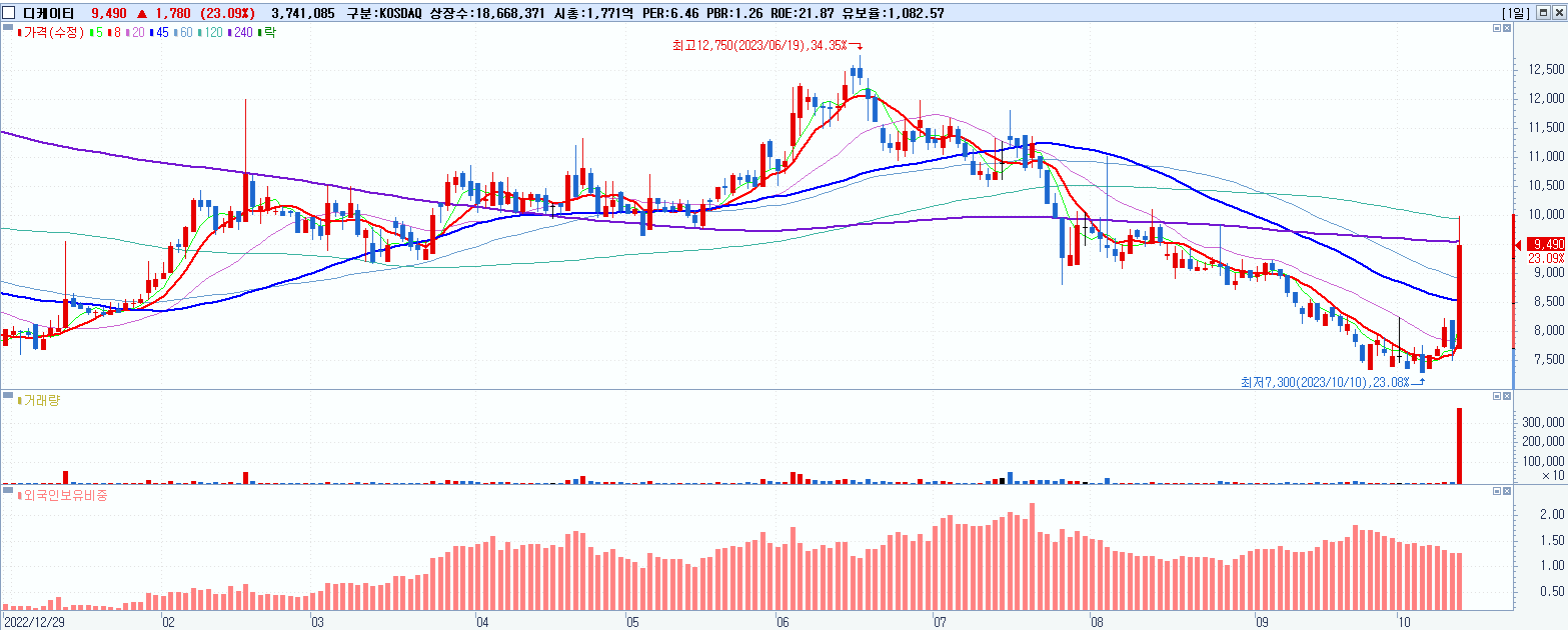 7.디케이티 9,490원 ▲ 23.09% (KOSDAQ, 290550)