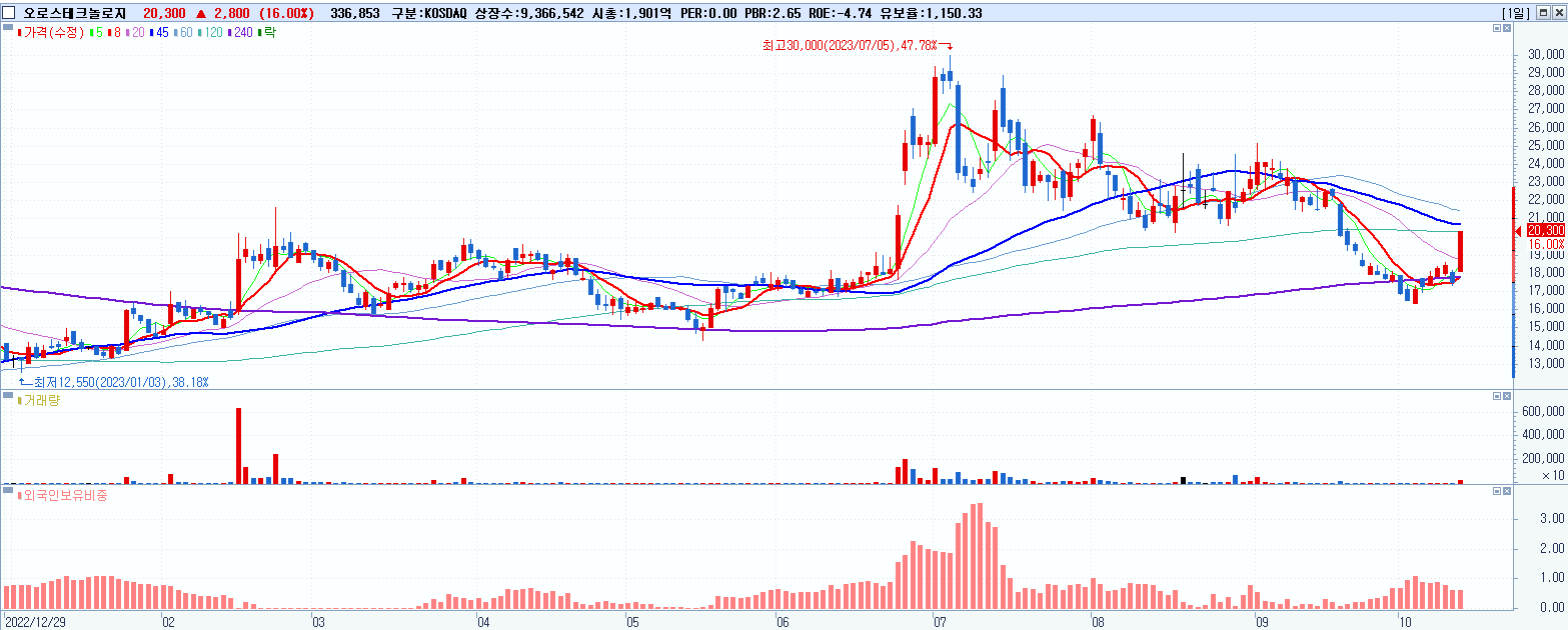 - 오로스테크놀로지 (20,300원 ▲ 16% , 시총: 1,901억, 거래량: 336,896, 거래대금:66억)