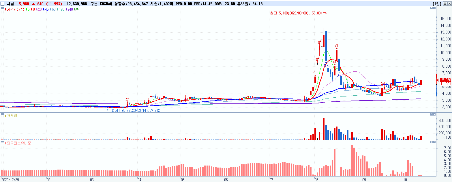 - 서남 (5,980원 ▲ 11.99% , 시총: 1,403억, 거래량: 12,640,374, 거래대금:750억)