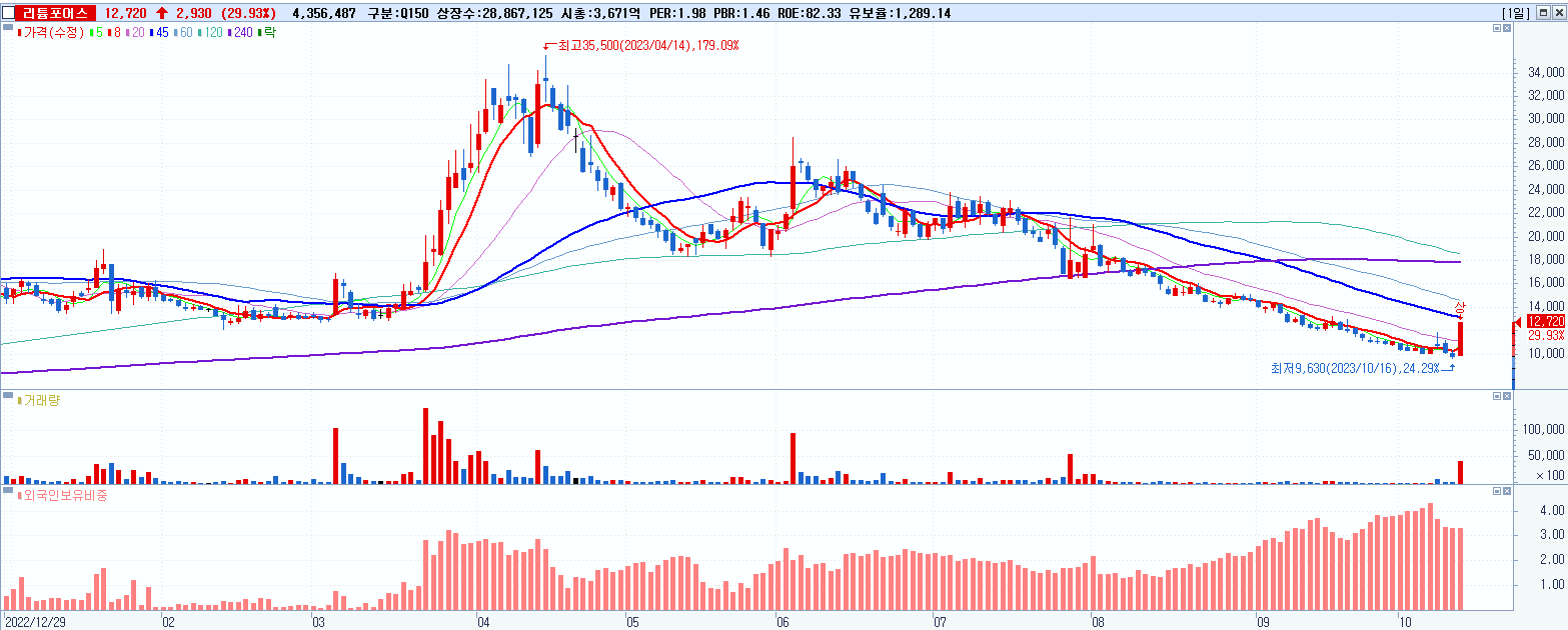 - 리튬포어스 (12,720원 ▲ 29.93% , 시총: 3,672억, 거래량: 4,356,611, 거래대금:526억)