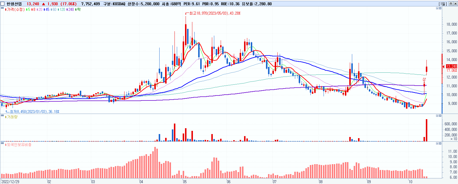 - 한창산업 (13,240원 ▲ 17.06% , 시총: 688억, 거래량: 7,759,827, 거래대금:1,021억)