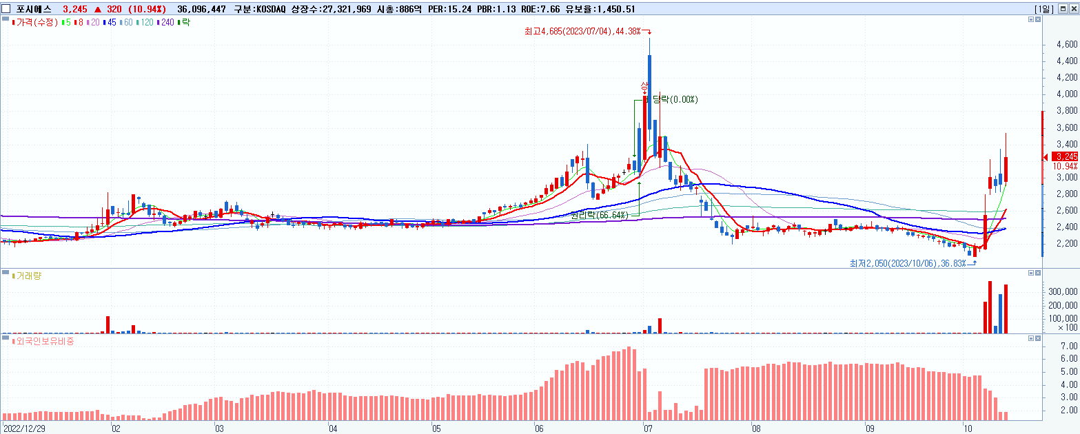 - 포시에스 (3,245원 ▲ 10.94% , 시총: 887억, 거래량: 36,117,067, 거래대금:1,182억)
