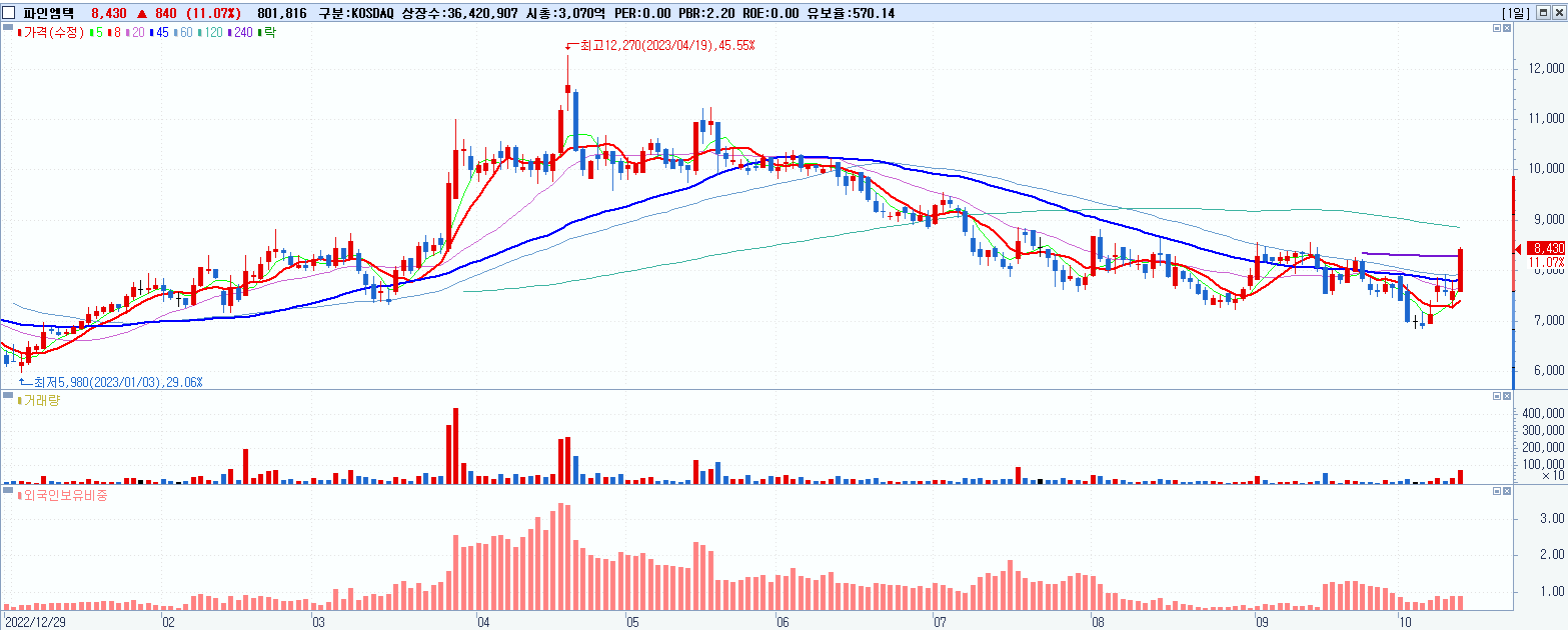 - 파인엠텍 (8,430원 ▲ 11.07% , 시총: 3,070억, 거래량: 802,140, 거래대금:66억)