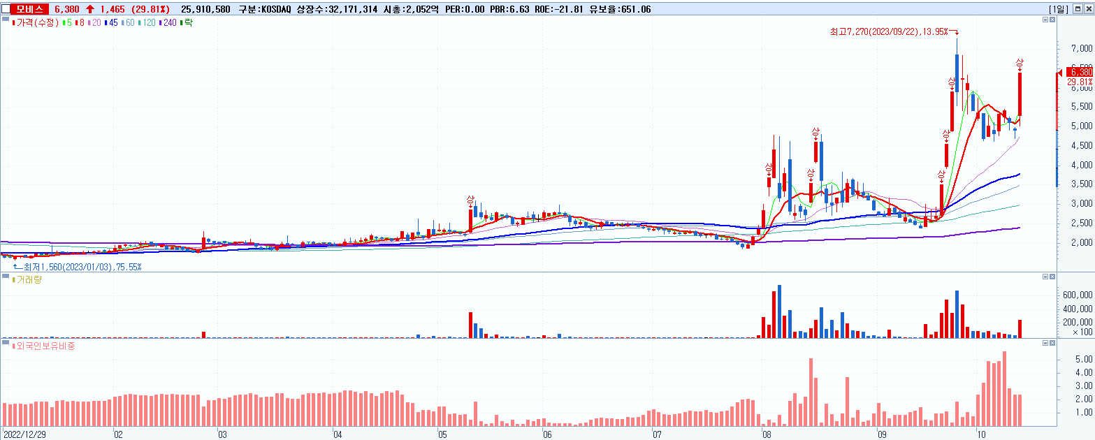 - 모비스 (6,380원 ▲ 29.81% , 시총: 2,053억, 거래량: 25,910,612, 거래대금:1,524억)