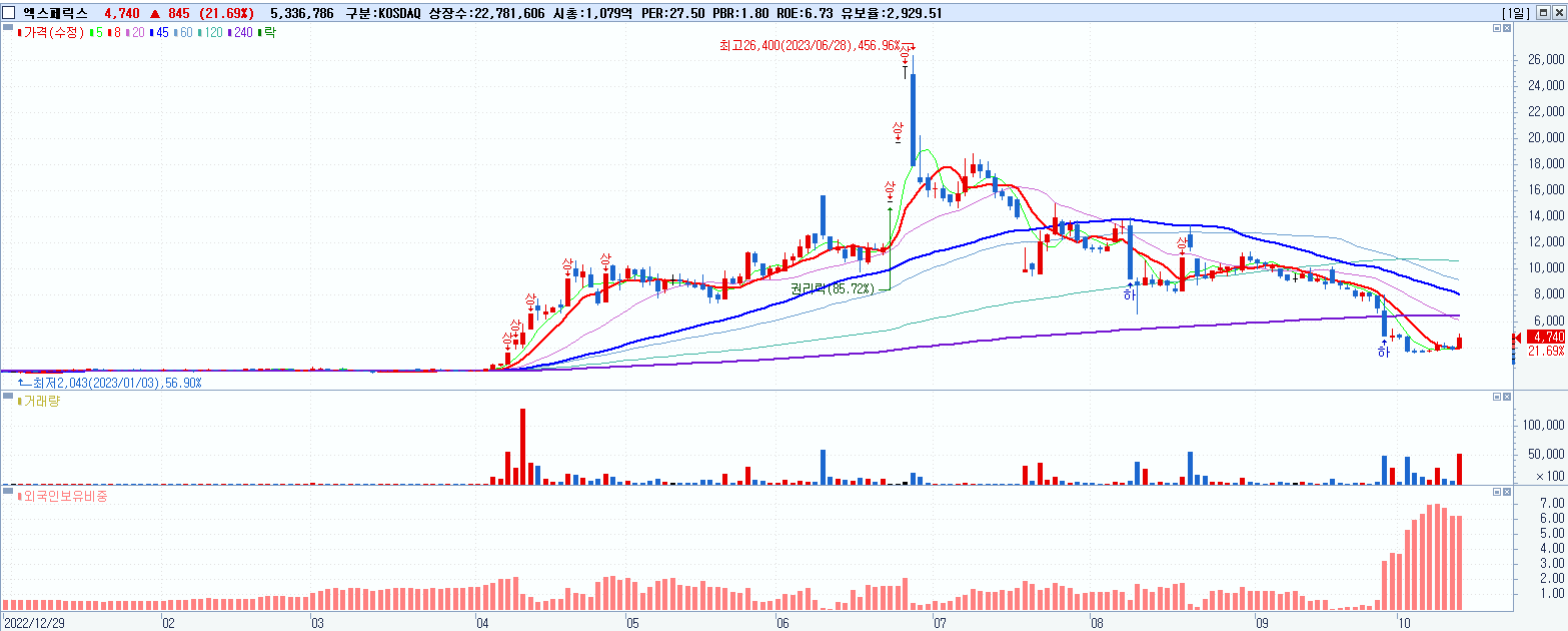 - 엑스페릭스 (4,740원 ▲ 21.69% , 시총: 1,080억, 거래량: 5,348,198, 거래대금:251억)