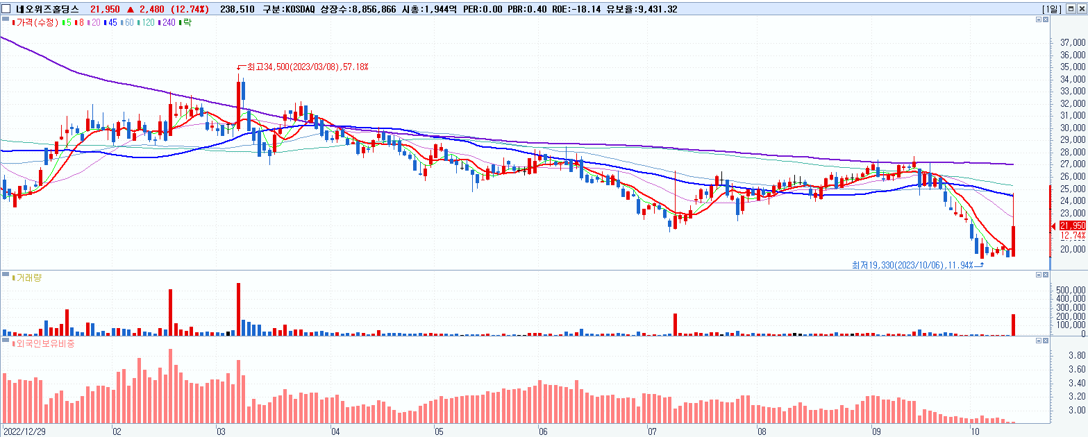 - 네오위즈홀딩스 (21,950원 ▲ 12.74% , 시총: 1,944억, 거래량: 238,702, 거래대금:55억)