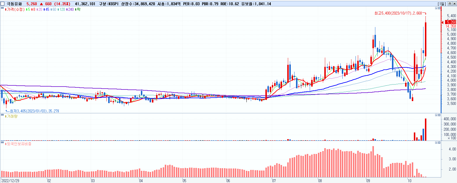 - 극동유화 (5,260원 ▲ 14.35% , 시총: 1,834억, 거래량: 41,417,115, 거래대금:2,110억)