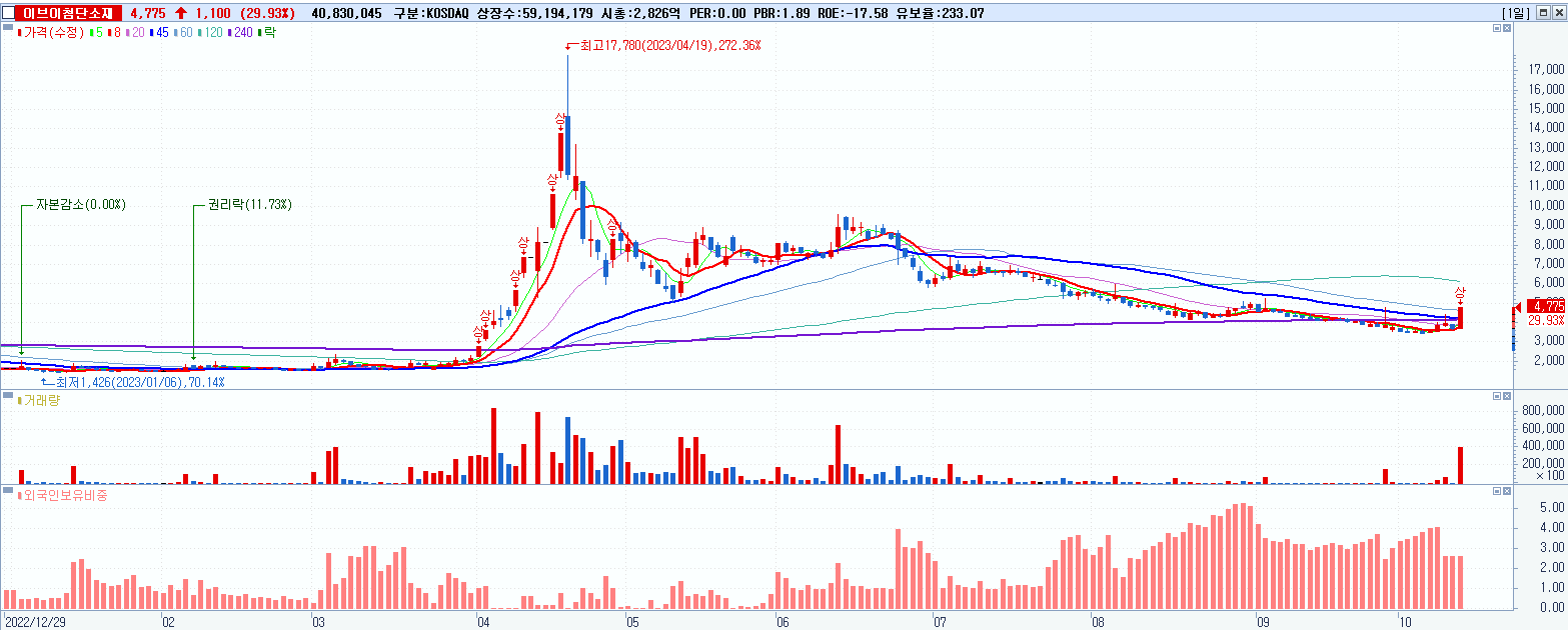 - 이브이첨단소재 (4,775원 ▲ 29.93% , 시총: 2,827억, 거래량: 40,914,907, 거래대금:1,827억)