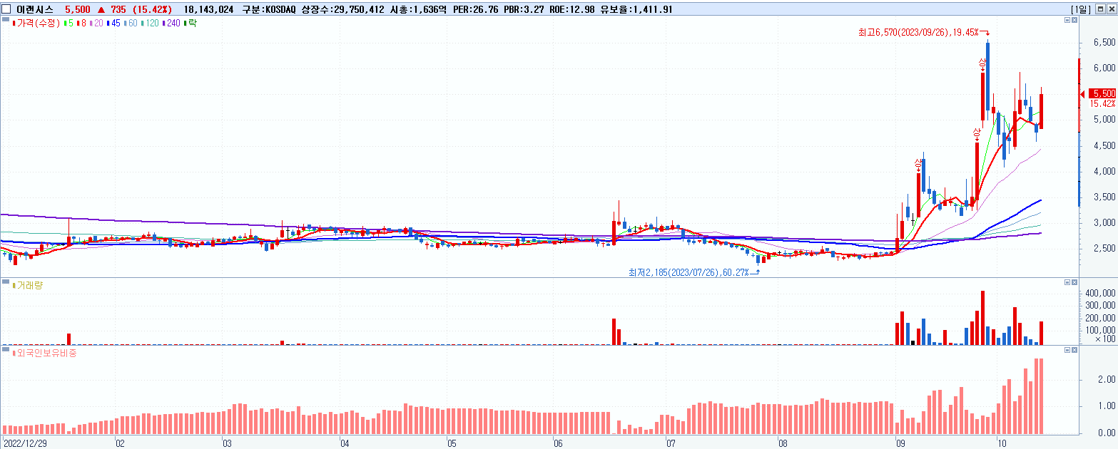 - 이랜시스 (5,500원 ▲ 15.42% , 시총: 1,636억, 거래량: 18,253,782, 거래대금:985억)