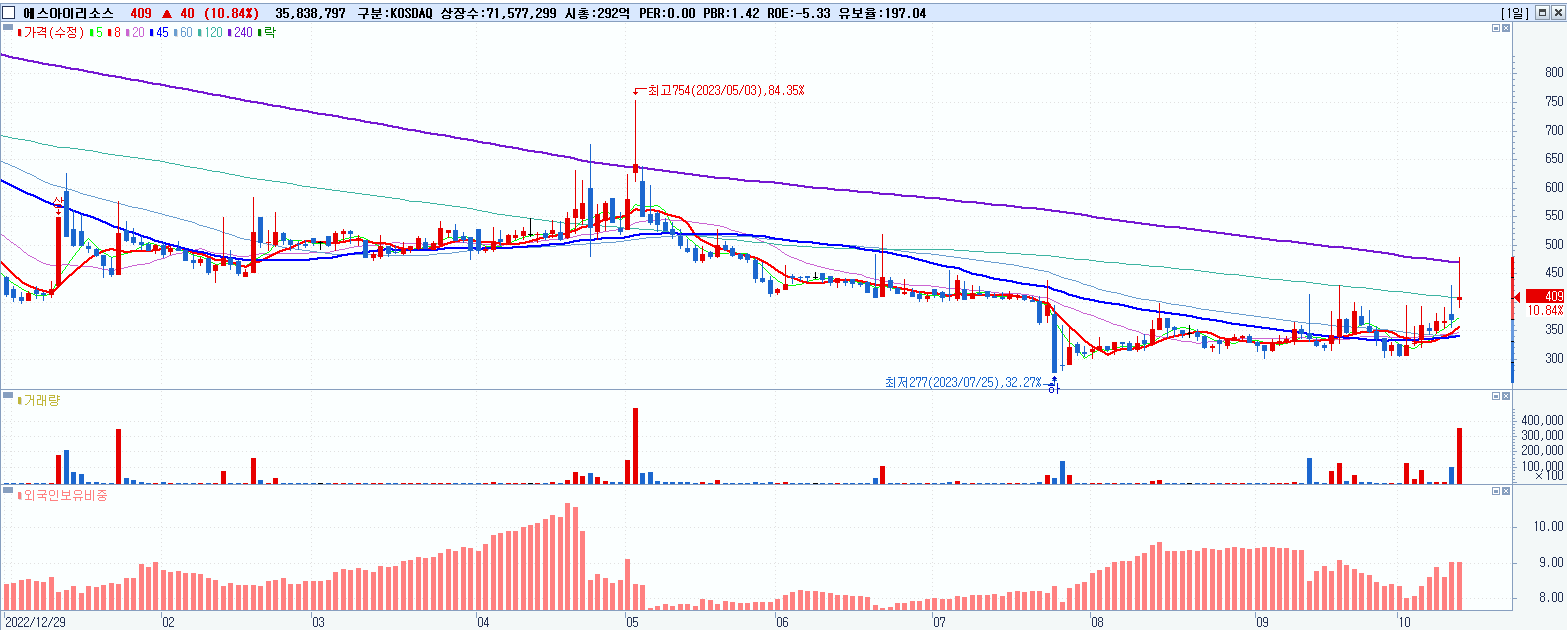 - 에스아이리소스 (409원 ▲ 10.84% , 시총: 293억, 거래량: 35,908,704, 거래대금:163억)