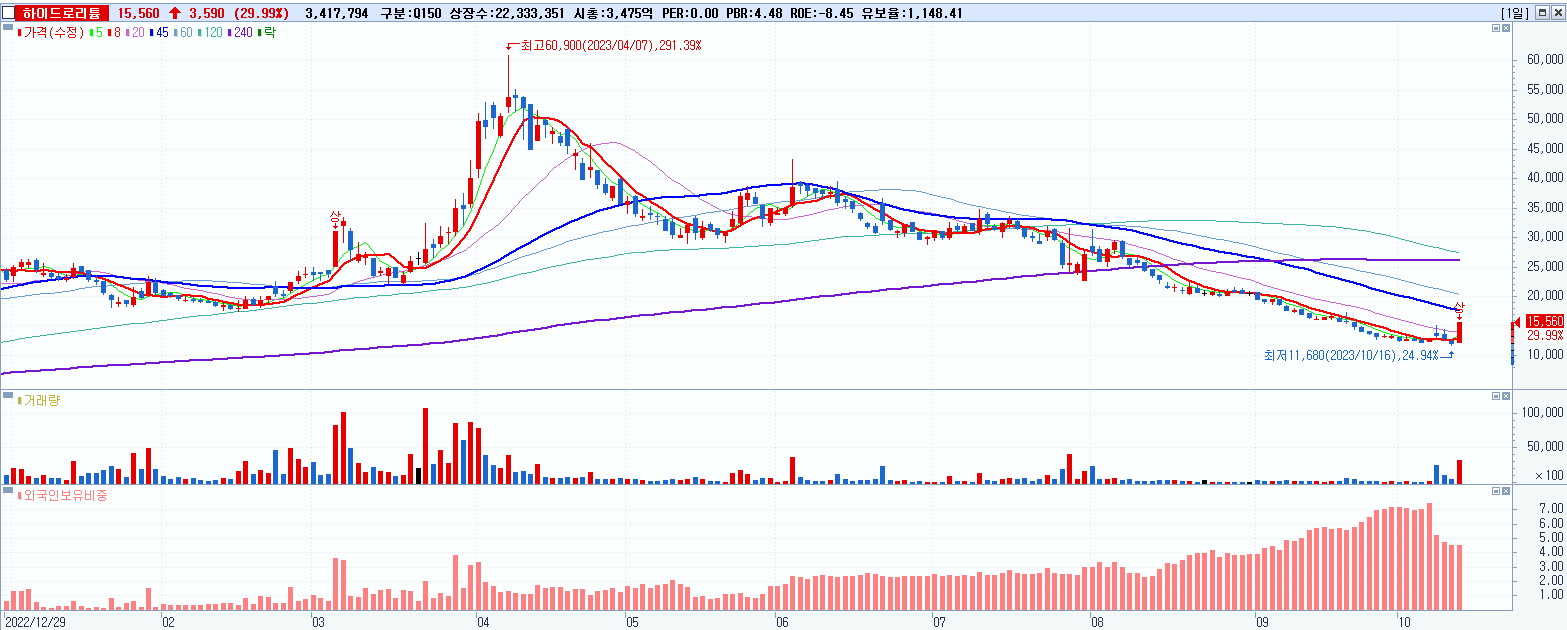 - 하이드로리튬 (15,560원 ▲ 29.99% , 시총: 3,475억, 거래량: 3,417,881, 거래대금:497억)