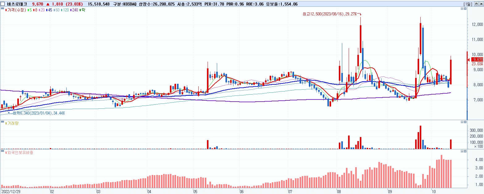 - 비츠로테크 (9,670원 ▲ 23.03% , 시총: 2,534억, 거래량: 15,683,596, 거래대금:1,456억)