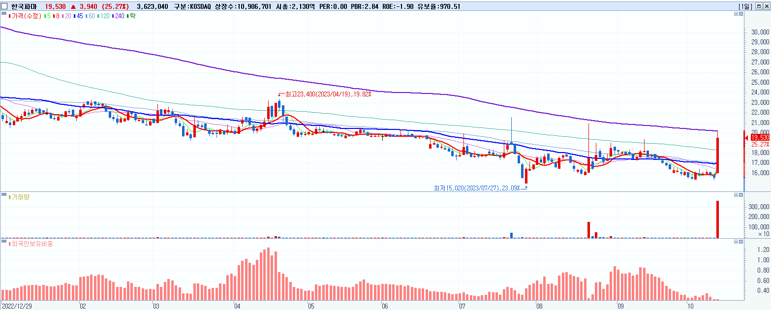 - 한국파마 (19,530원 ▲ 25.27% , 시총: 2,130억, 거래량: 3,625,658, 거래대금:696억)