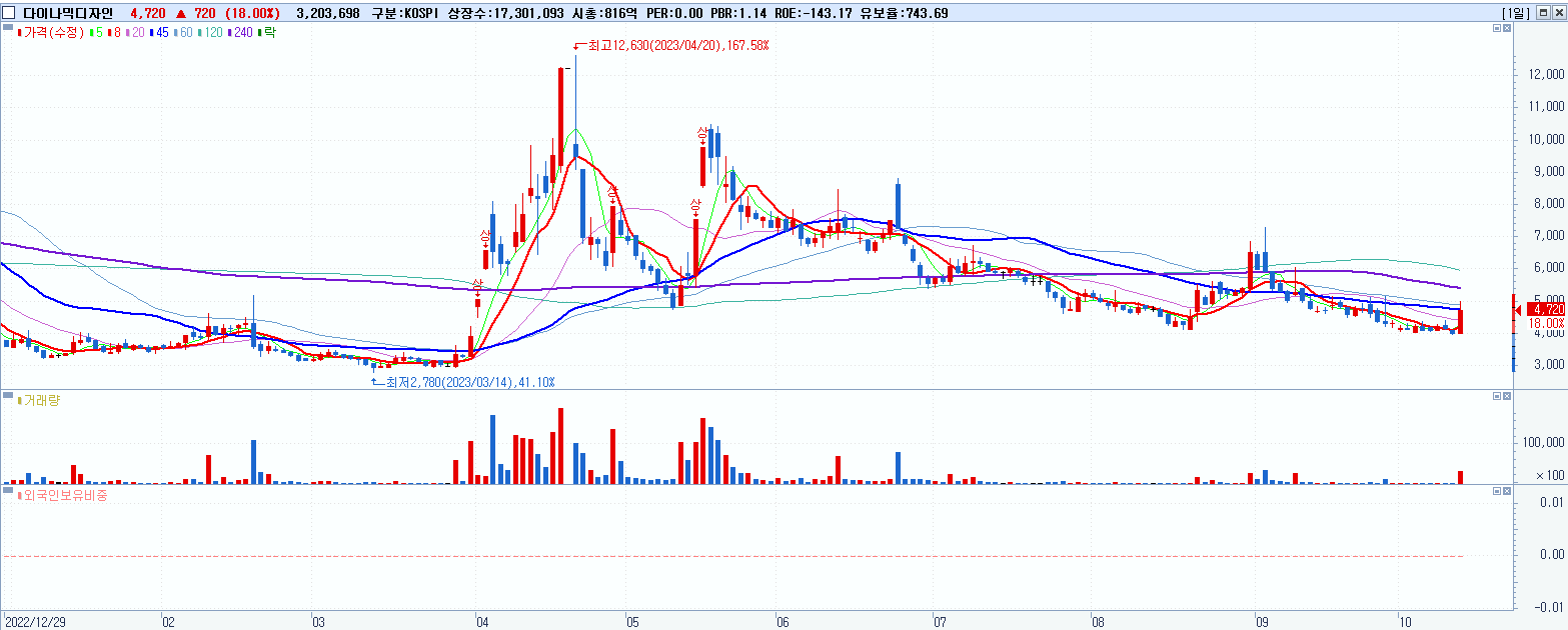 - 다이나믹디자인 (4,720원 ▲ 18% , 시총: 817억, 거래량: 3,206,240, 거래대금:151억)