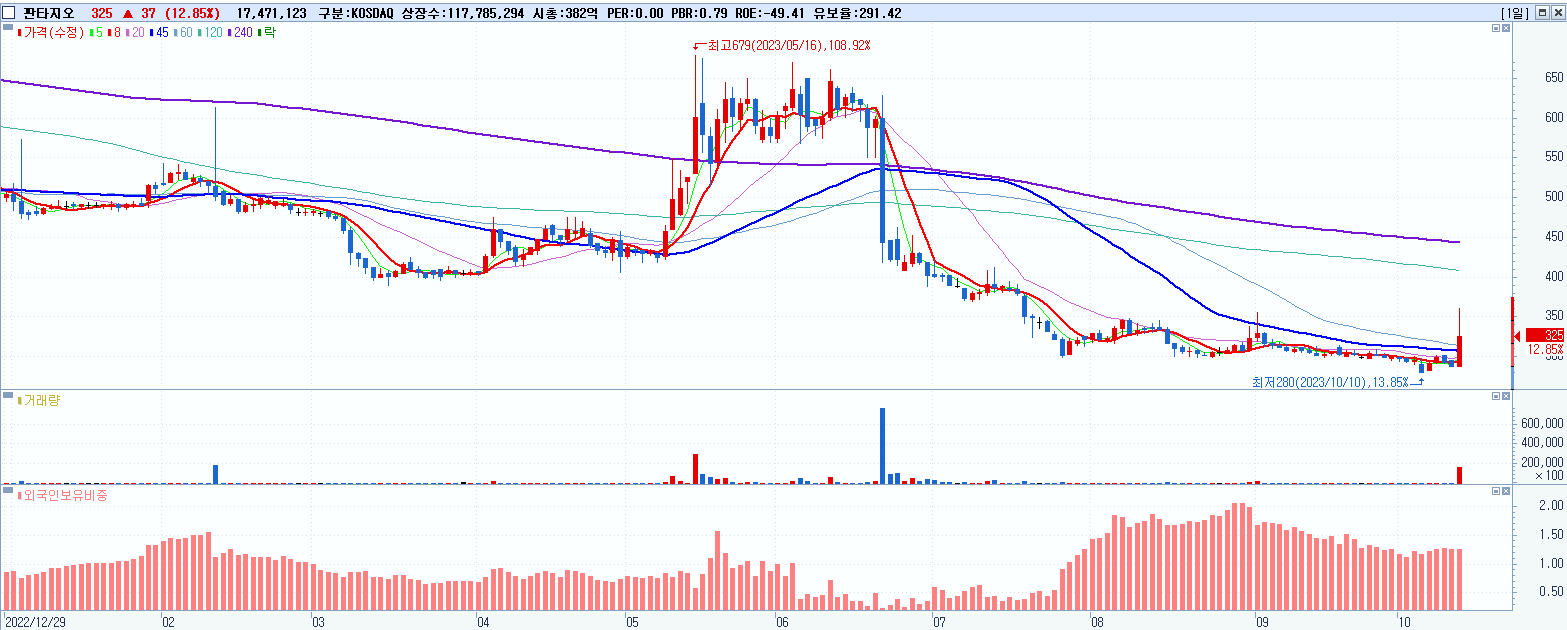 - 판타지오 (325원 ▲ 12.85% , 시총: 383억, 거래량: 17,533,505, 거래대금:59억)