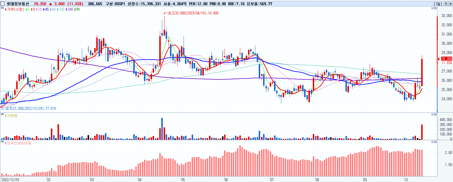 - 롯데정보통신 (28,350원 ▲ 11.83% , 시총: 4,365억, 거래량: 306,735, 거래대금:85억)