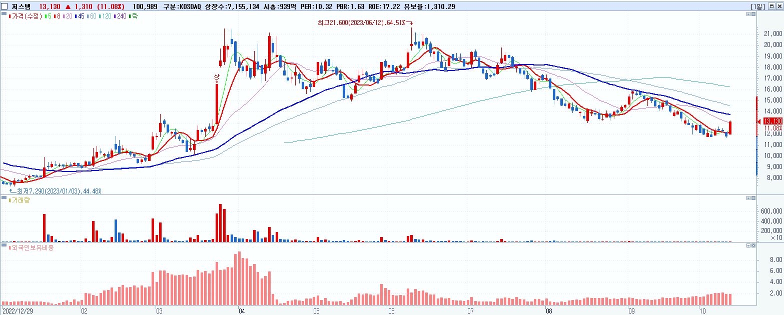 - 저스템 (13,130원 ▲ 11.08% , 시총: 939억, 거래량: 100,991, 거래대금:13억)
