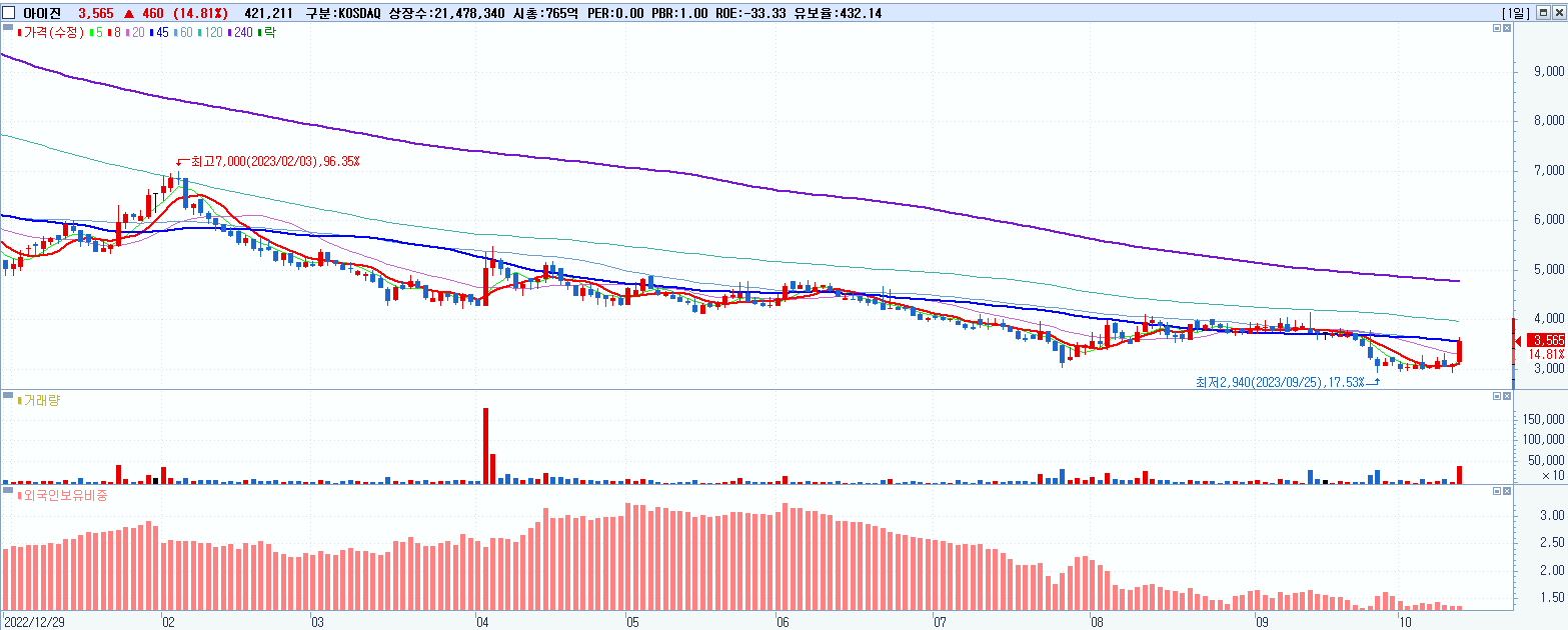 - 아이진 (3,565원 ▲ 14.81% , 시총: 766억, 거래량: 421,219, 거래대금:15억)