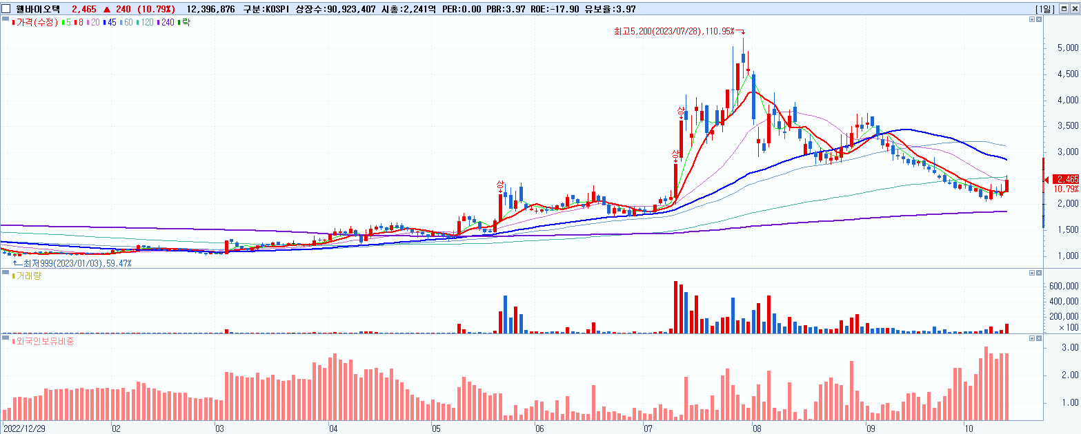 - 웰바이오텍 (2,465원 ▲ 10.79% , 시총: 2,241억, 거래량: 12,422,009, 거래대금:302억)