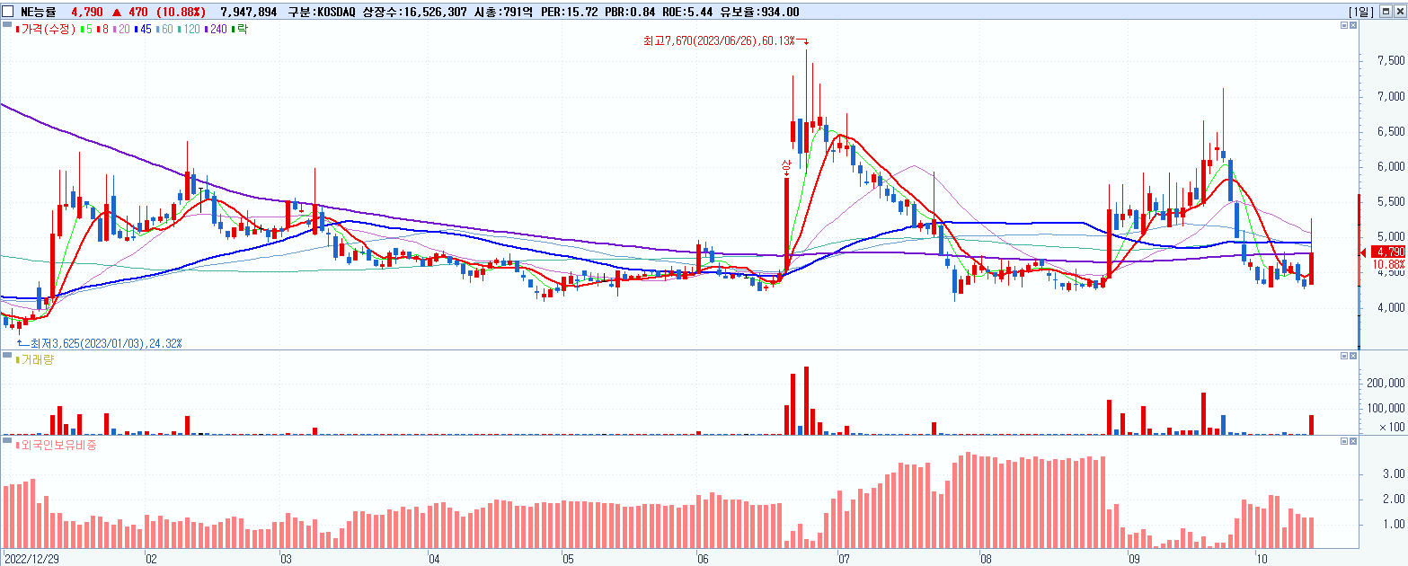 - NE능률 (4,790원 ▲ 10.88% , 시총: 792억, 거래량: 7,948,095, 거래대금:392억)