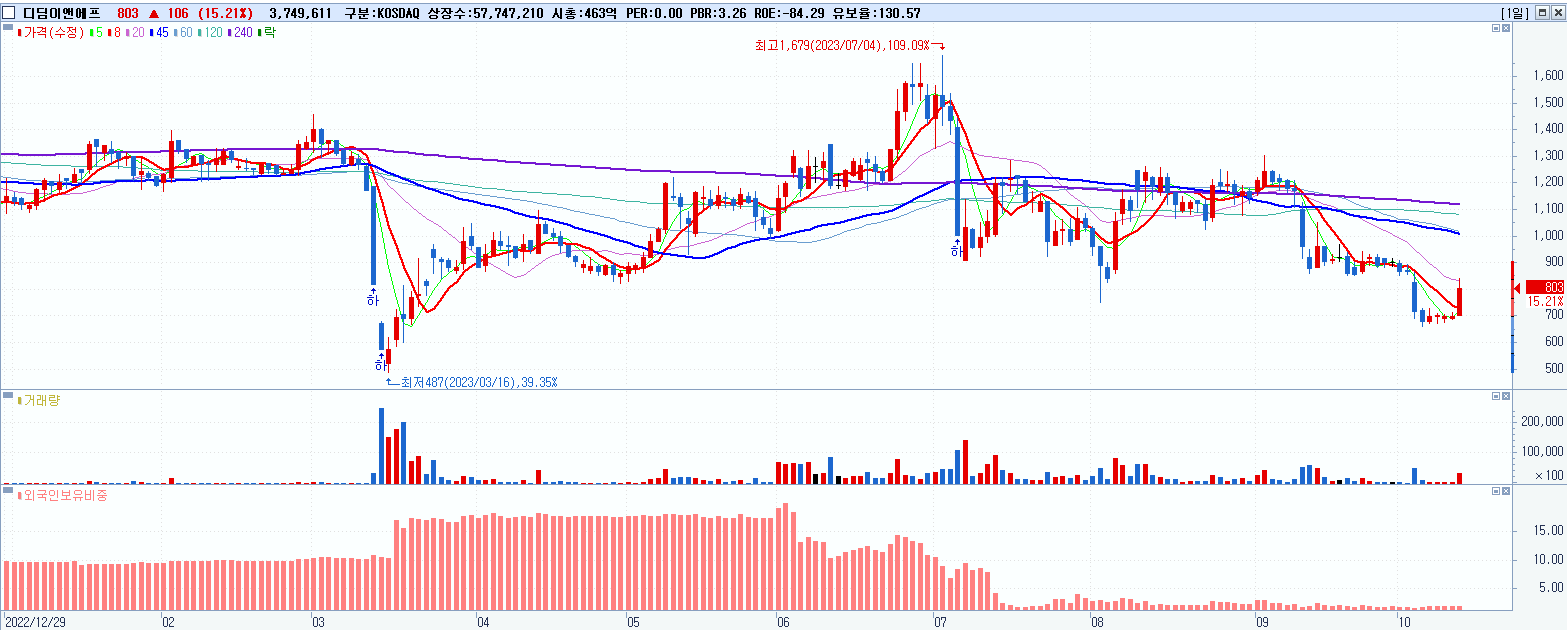 - 디딤이앤에프 (803원 ▲ 15.21% , 시총: 464억, 거래량: 3,749,863, 거래대금:30억)