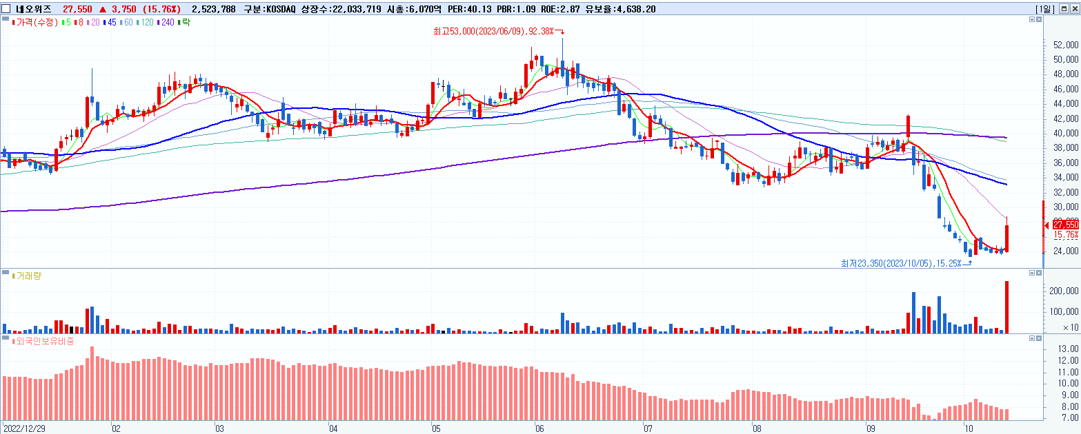 - 네오위즈 (27,550원 ▲ 15.76% , 시총: 6,070억, 거래량: 2,524,474, 거래대금:690억)