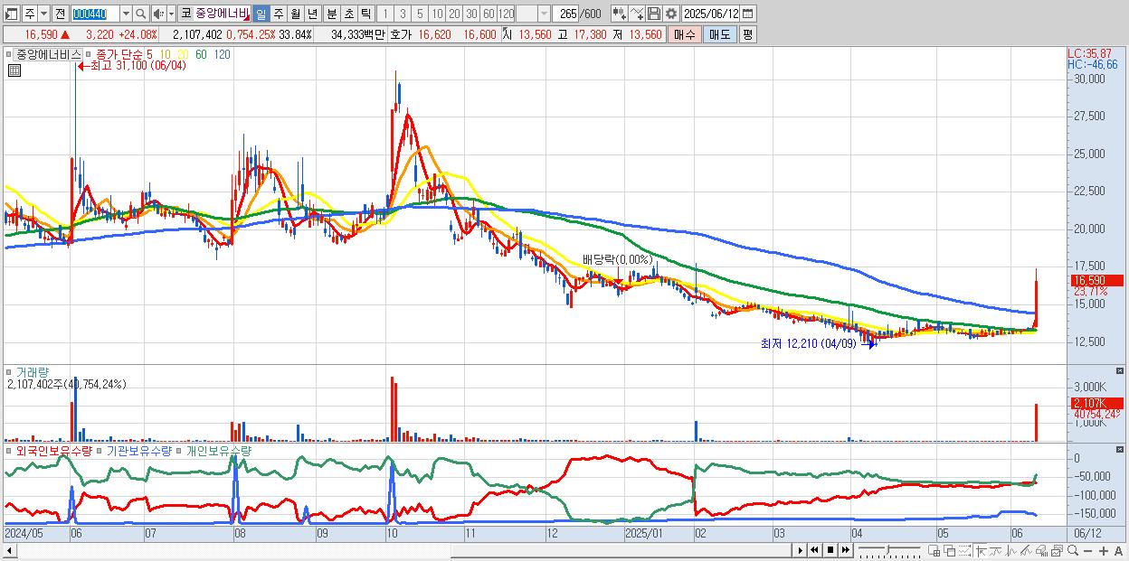 - 중앙에너비스 (16,770원 ▲ 25.43% , 시총: 1,044억, 거래량: 932,422, 거래대금:151억)
