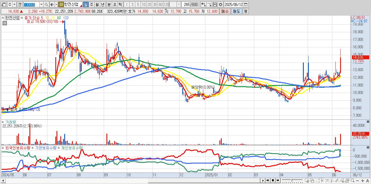 - 한전산업 (14,690원 ▲ 18.76% , 시총: 4,789억, 거래량: 11,962,052, 거래대금:1,750억)