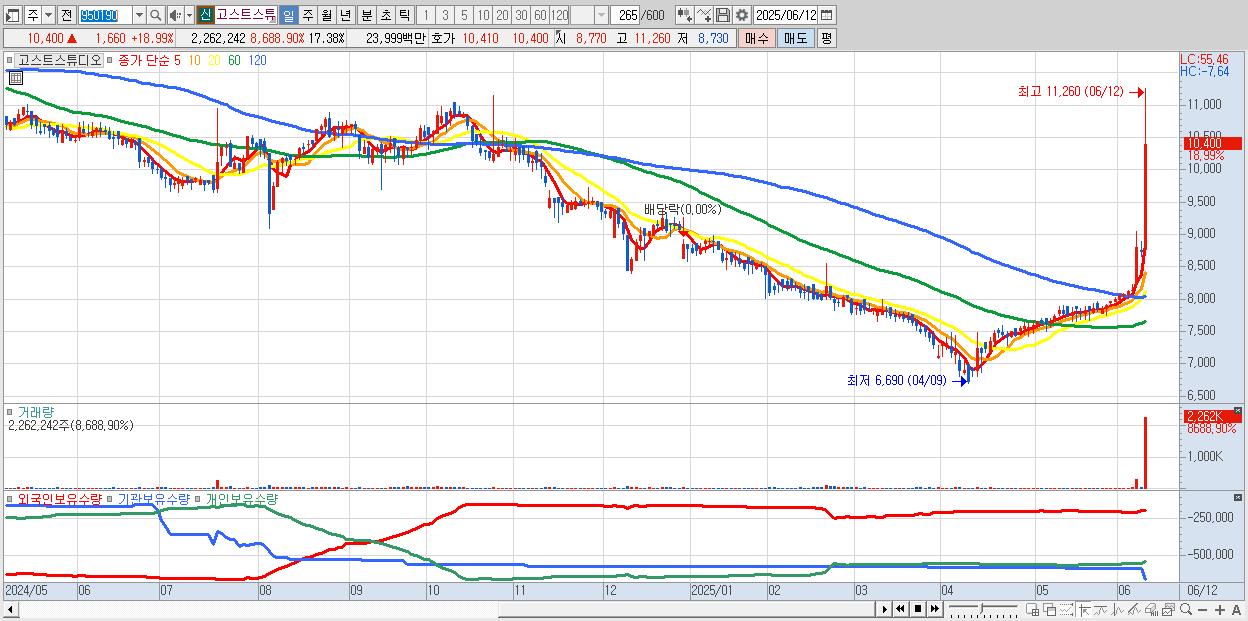 - 고스트스튜디오 (10,400원 ▲ 18.99% , 시총: 1,354억, 거래량: 2,262,242, 거래대금:240억)