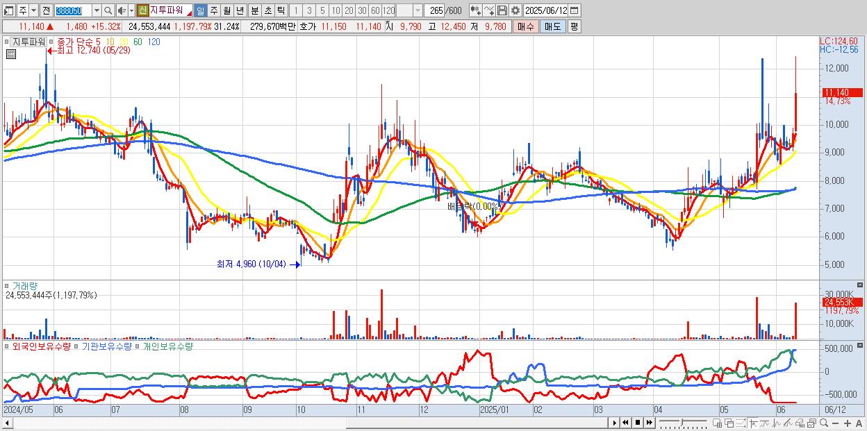 - 지투파워 (11,190원 ▲ 15.84% , 시총: 2,094억, 거래량: 10,399,276, 거래대금:1,204억)