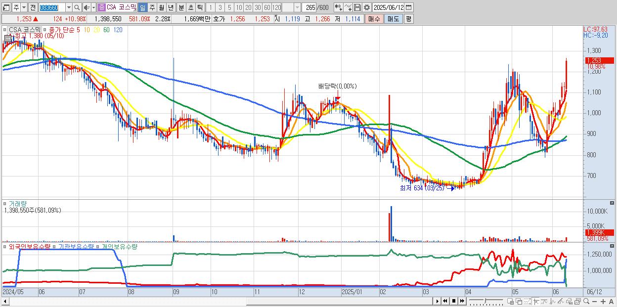 - CSA 코스믹 (1,253원 ▲ 10.98% , 시총: 767억, 거래량: 1,398,550, 거래대금:17억)