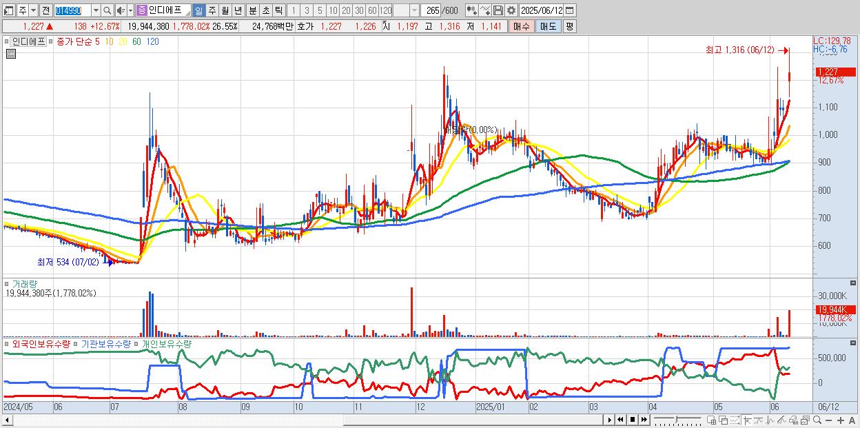 - 인디에프 (1,227원 ▲ 12.67% , 시총: 922억, 거래량: 19,944,380, 거래대금:248억)