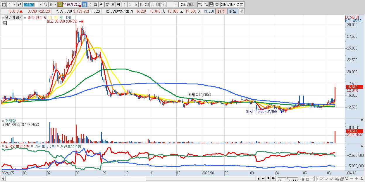 - 넥슨게임즈 (15,240원 ▲ 11.08% , 시총: 10,037억, 거래량: 2,249,781, 거래대금:335억)