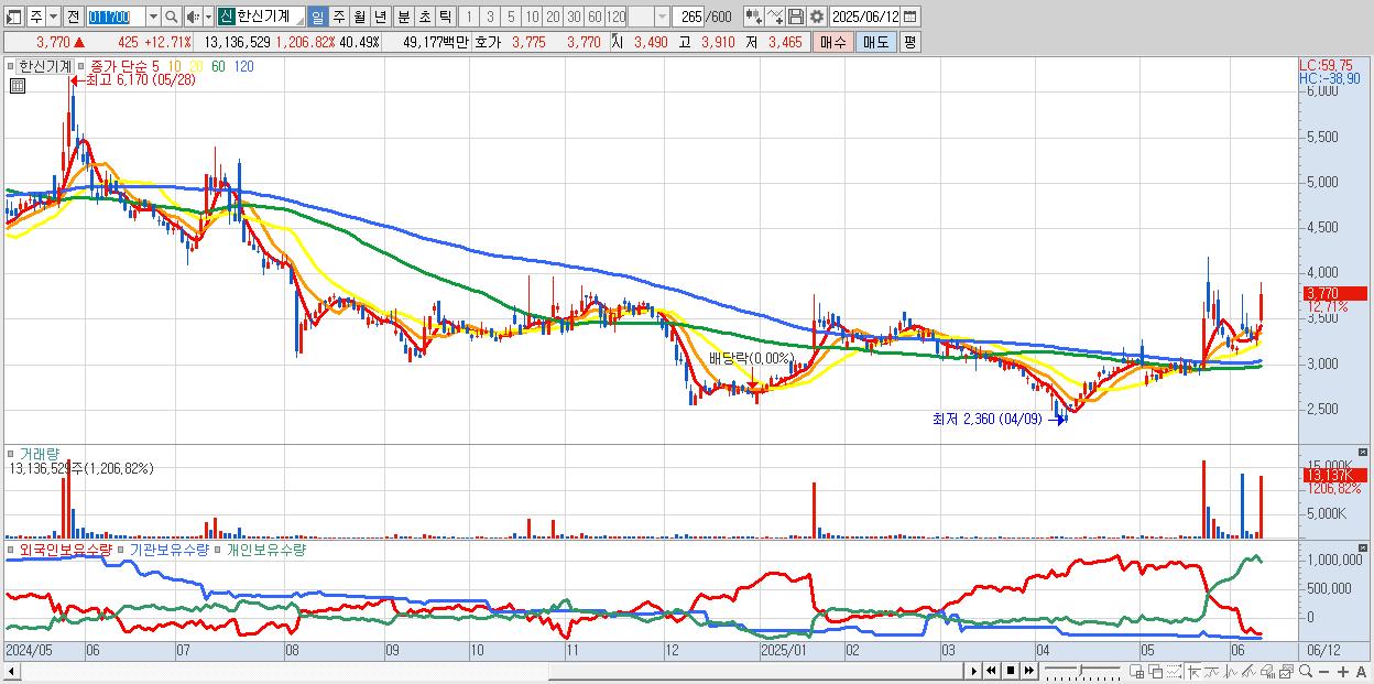 - 한신기계 (3,770원 ▲ 12.71% , 시총: 1,223억, 거래량: 13,136,529, 거래대금:492억)