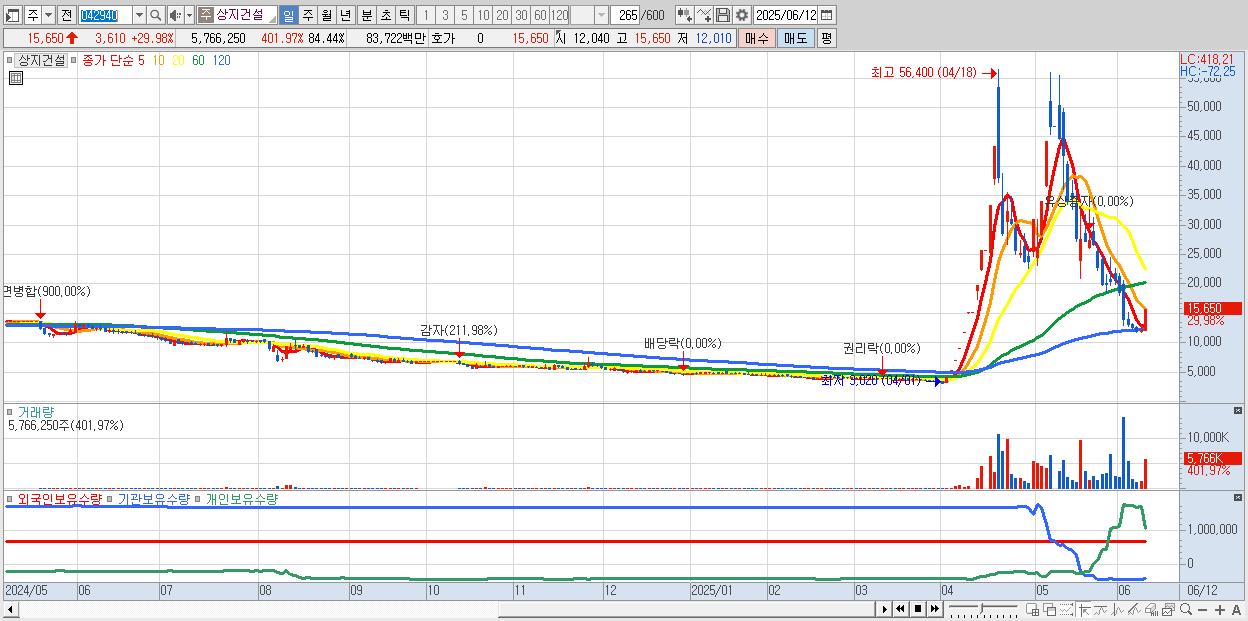 - 상지건설 (15,650원 ▲ 29.98% , 시총: 1,069억, 거래량: 5,766,250, 거래대금:837억)