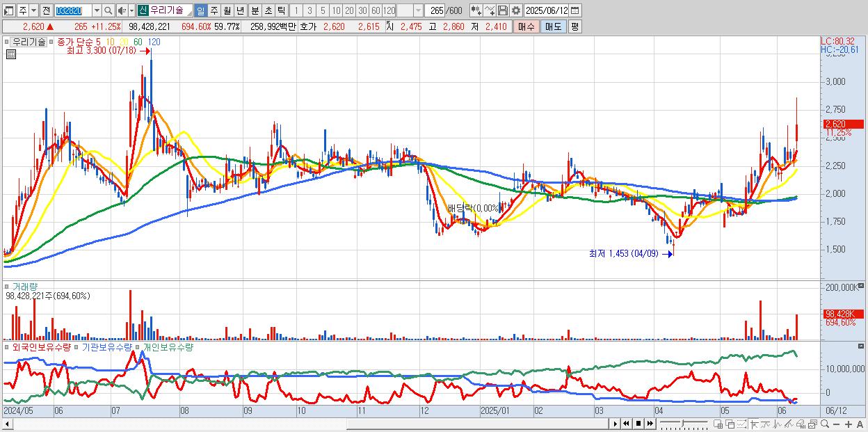 - 우리기술 (2,620원 ▲ 11.25% , 시총: 4,315억, 거래량: 98,428,221, 거래대금:2,590억)