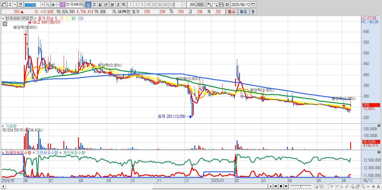 - 한국ANKOR유전 (259원 ▲ 13.6% , 시총: 181억, 거래량: 55,524,591, 거래대금:153억)